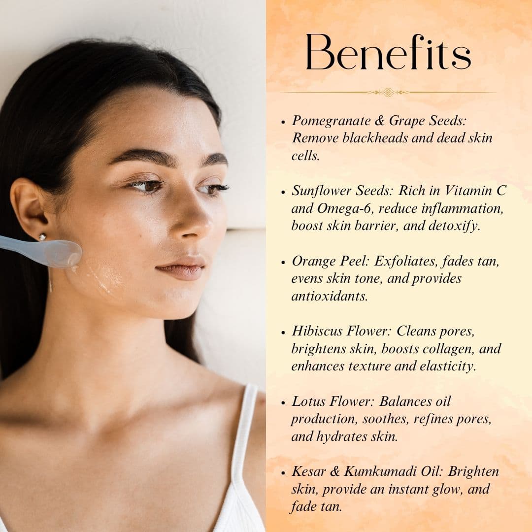 Infused with Kumkumadi oil, this exfoliator removes dead skin cells and reveals a soft, healthy glow. It's perfect in the self-care routine of any woman as it has a feeling of renewal and pampering.